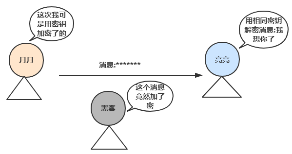 “可以呀,你发送消息给我的时候用密钥加密,然后我收到消息用同样的算法,同样的密钥解密就行了,这有个专业术语叫做对称加密”