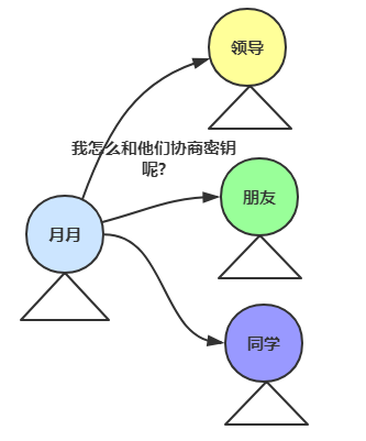 “听上去不错,可是你这个有问题呀,和你一个人通信这样倒是可以,但是和其他人通信怎么办呢?我和他们怎么协商密钥呢?”