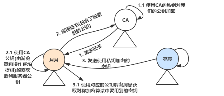 “CA其实也是使用了非对称加密算法,首先使用CA的私钥对我们的公钥加密,然后它会给你返回一个证书,里面包含了加密之后的公钥,然后你本地使用CA公钥解密这个证书就可以获取到我们的公钥了。你老公我是不是很聪明呀?”