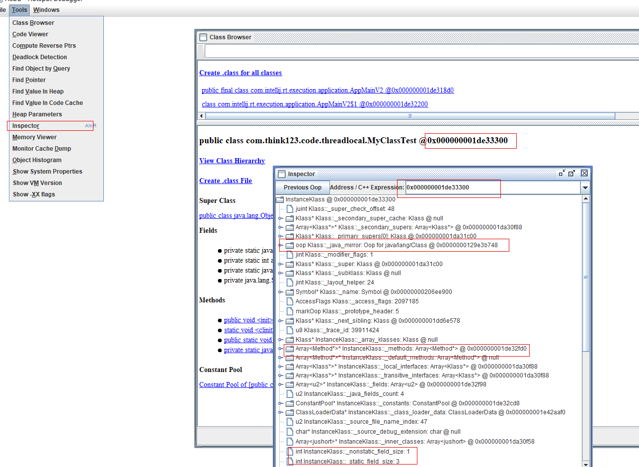 我们需要记住的是在JVM内部实例对象和Class是分别使用不同的数据结构来表示的(oop,Klass),我们可以借助HSDB工具来查看它们在JVM中的数据结构。